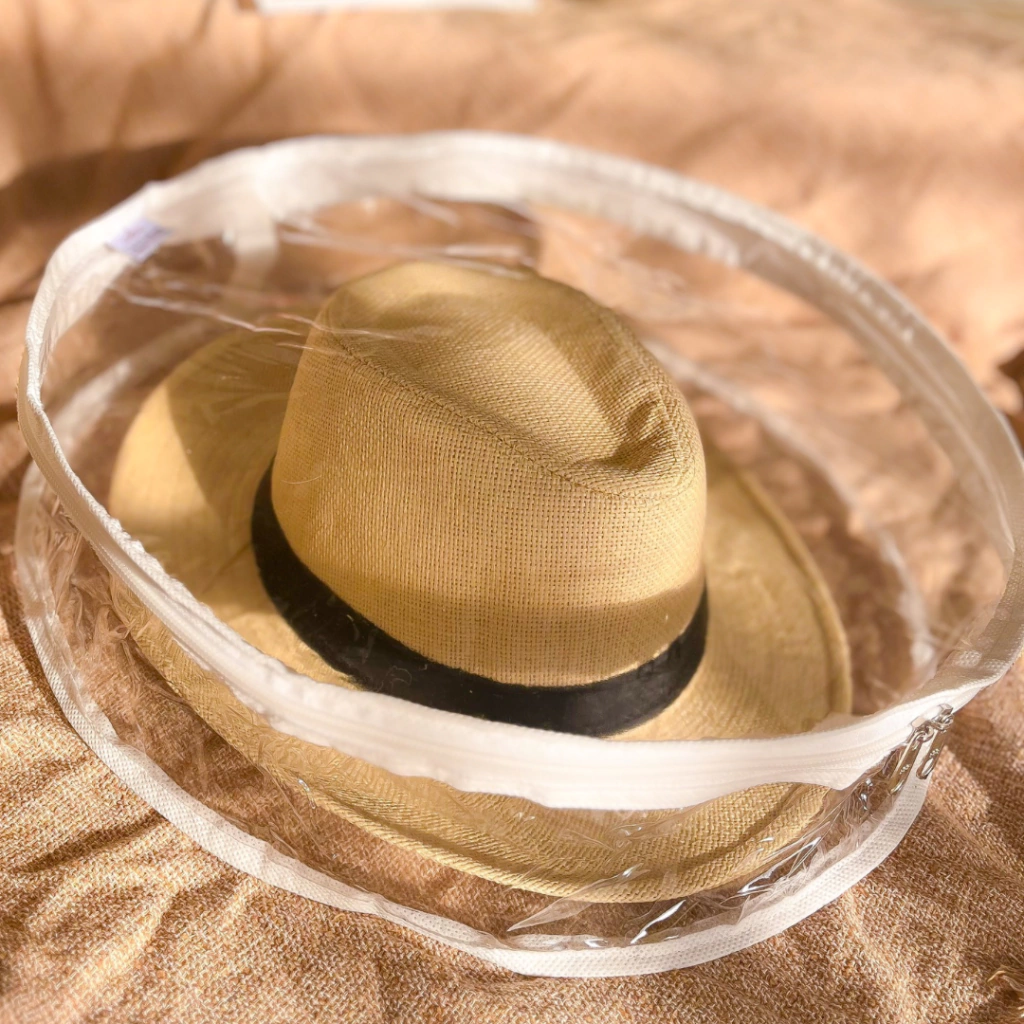 Confeccionada em plástico transparente com acabamento em viés branco, essa capa oferece proteção contra poeira, preservando a forma e a beleza do seu chapéu.