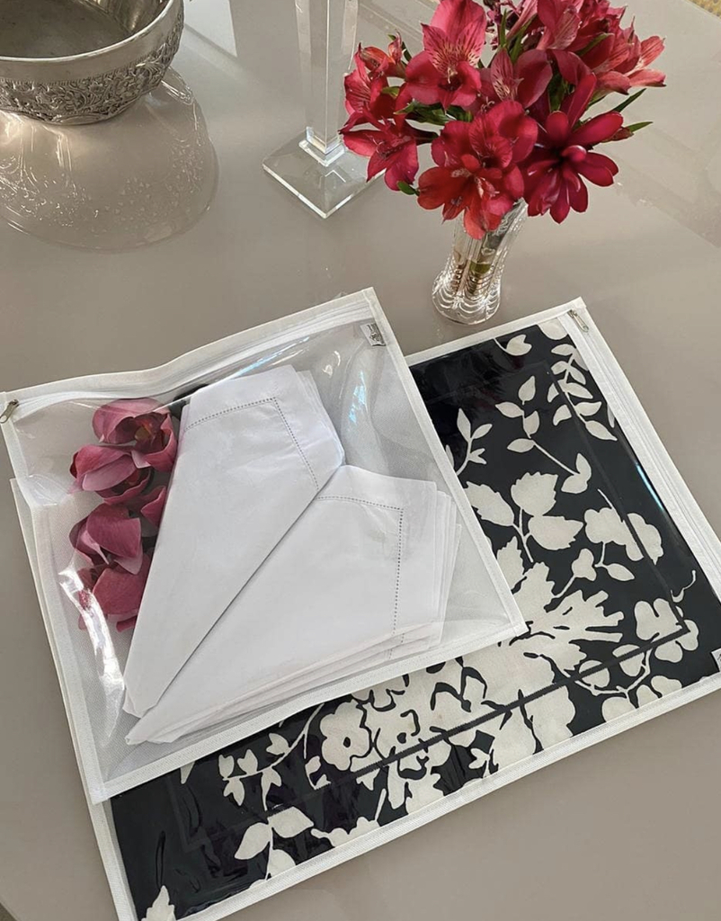 Envelope Multiuso, confeccionado em tnt e plástico cristal, com fechamento em zíper. Ideal para organizar jogos americanos, sousplast, toalhas de mesa, vestidos de festa, roupas delicadas, saídas de paria, bíquinis e muito mais.